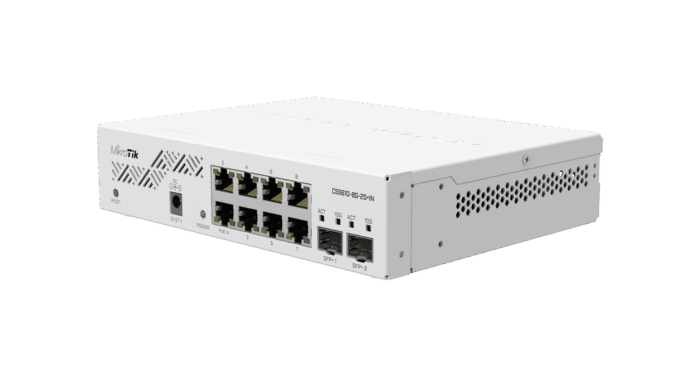 The MikroTik CSS610-8G-2S+IN is a very compact and powerful switch. It is perfectly designed for small to medium-sized networks. This versatile device features eight Gigabit Ethernet ports. It also includes two 10 Gigabit SFP+ ports. These provide high-speed uplinks for demanding connections. The SFP+ ports support both 1.25 Gb SFP and 10 Gb SFP+ modules. This ensures flexible fiber connectivity options.