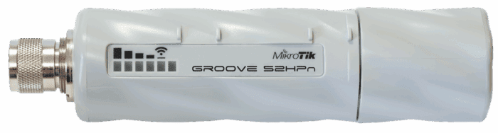 Our smallest outdoor series model – a fully featured wireless RouterBOARD powered by RouterOS. Weatherproof, durable and ready to use. It has one 10/100 Ethernet port with PoE support and a built in wireless radio. It has software selectable 2 or 5GHz wireless mode, and high output power!_x000D_ With the Nv2 TDMA technology, up to 125Mbit aggregate throughput is possible! It has a built-in N-male connector, and pole attachment points, so you can attach it to an antenna directly, or use a standard antenna cable. LED signal indicators make it easy to install and align._x000D_ Box contains: Groove unit, mounting loops, PoE injector and power adapter