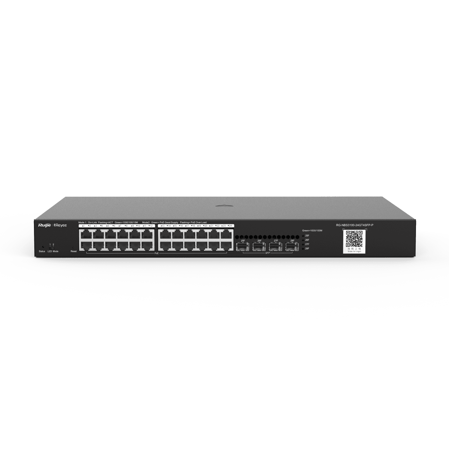 Ruijie RG-NBS3100-24GT4SFP-P. 28-Port Gigabit Layer 2 Cloud Managed PoE Switch with 24 PoE+ ports & 4 SFP uplinks.