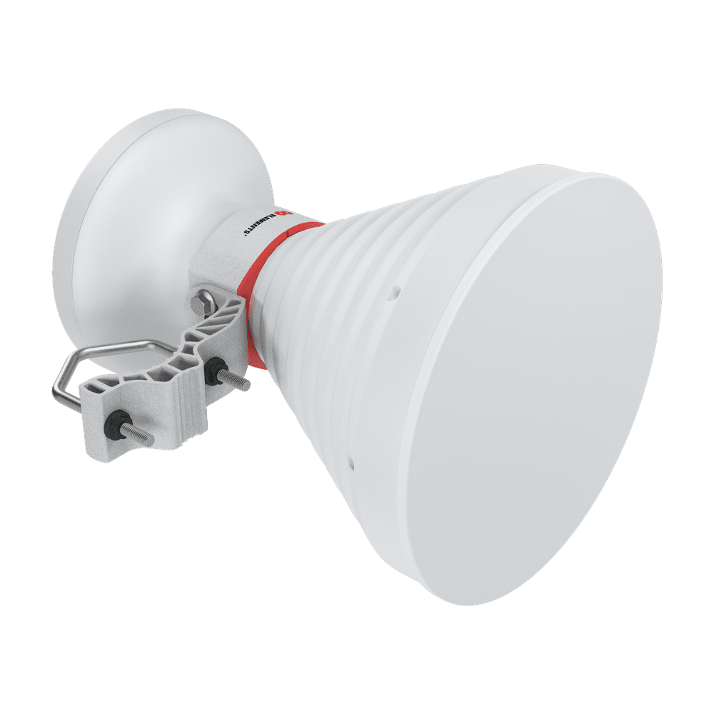 The StarterHorn™ 30° USMA is an affordable horn sector antenna that delivers excellent noise rejection and coverage stability, making it an accessible entry point to horn antenna technology. It is a scalar horn antenna with a symmetrical radiation pattern, featuring a circular cross-section where both azimuth and elevation beam widths are 30° at -6dB. Crucially, it has zero side lobes, ensuring efficient spectrum use and preventing high interference in wireless networks. This design contributes to a high Beam Efficiency (BE) of 92%, significantly increasing throughput. Its beam width and gain remain stable across 5 GHz frequencies (U-NII-1 to U-NII-3), ensuring reliable performance regardless of channel changes. The antenna offers flexible connectivity with RP-SMA ports for coaxial radios and a waveguide port for Ubiquiti IsoStation and PrismStation. Compact, durable (aluminum build, stainless steel hardware), and easy to assemble/install, it excels in dense co-location deployments.